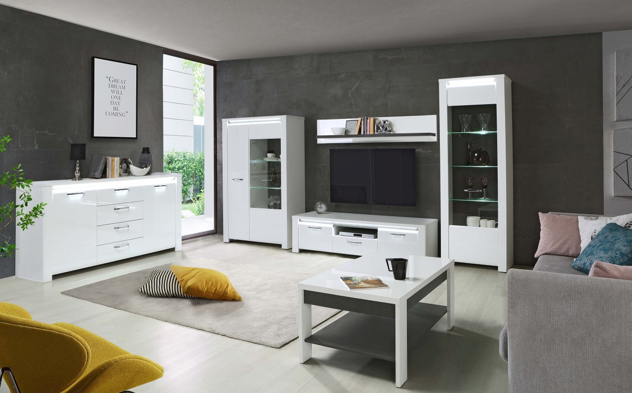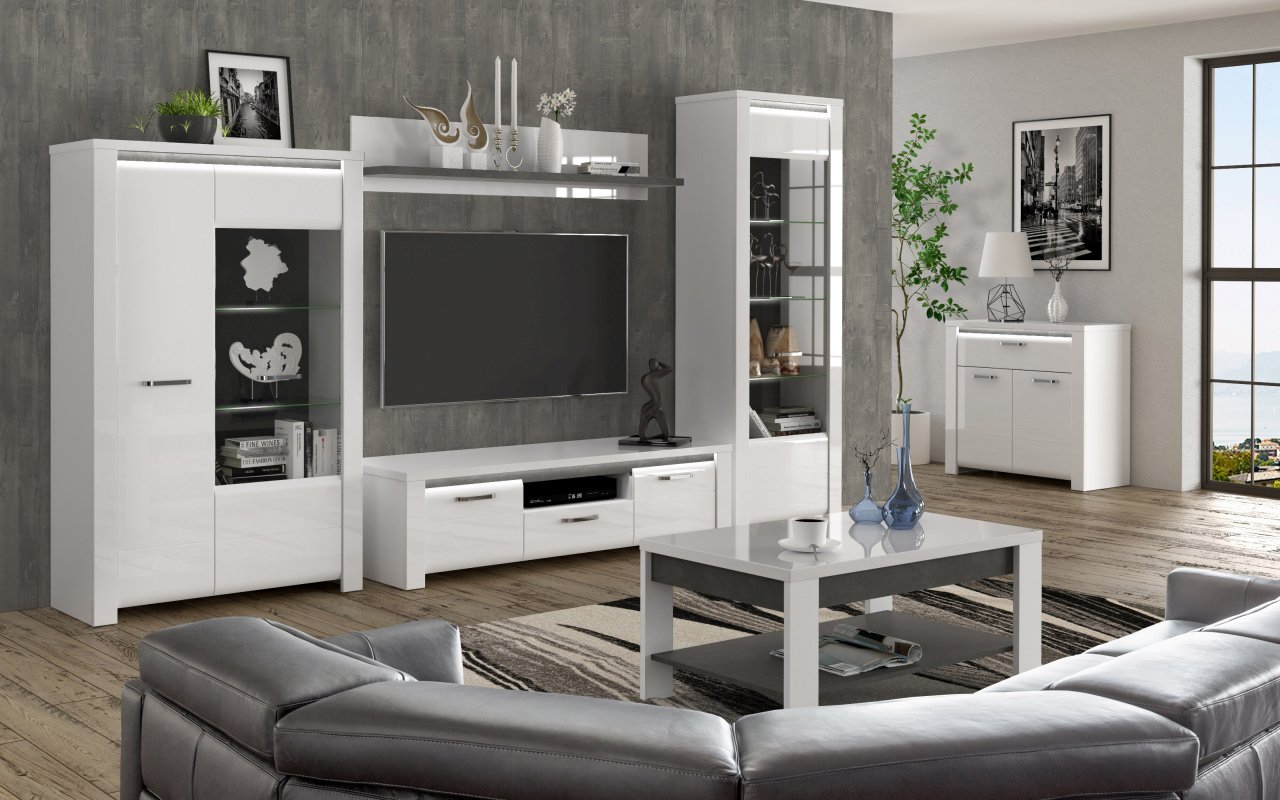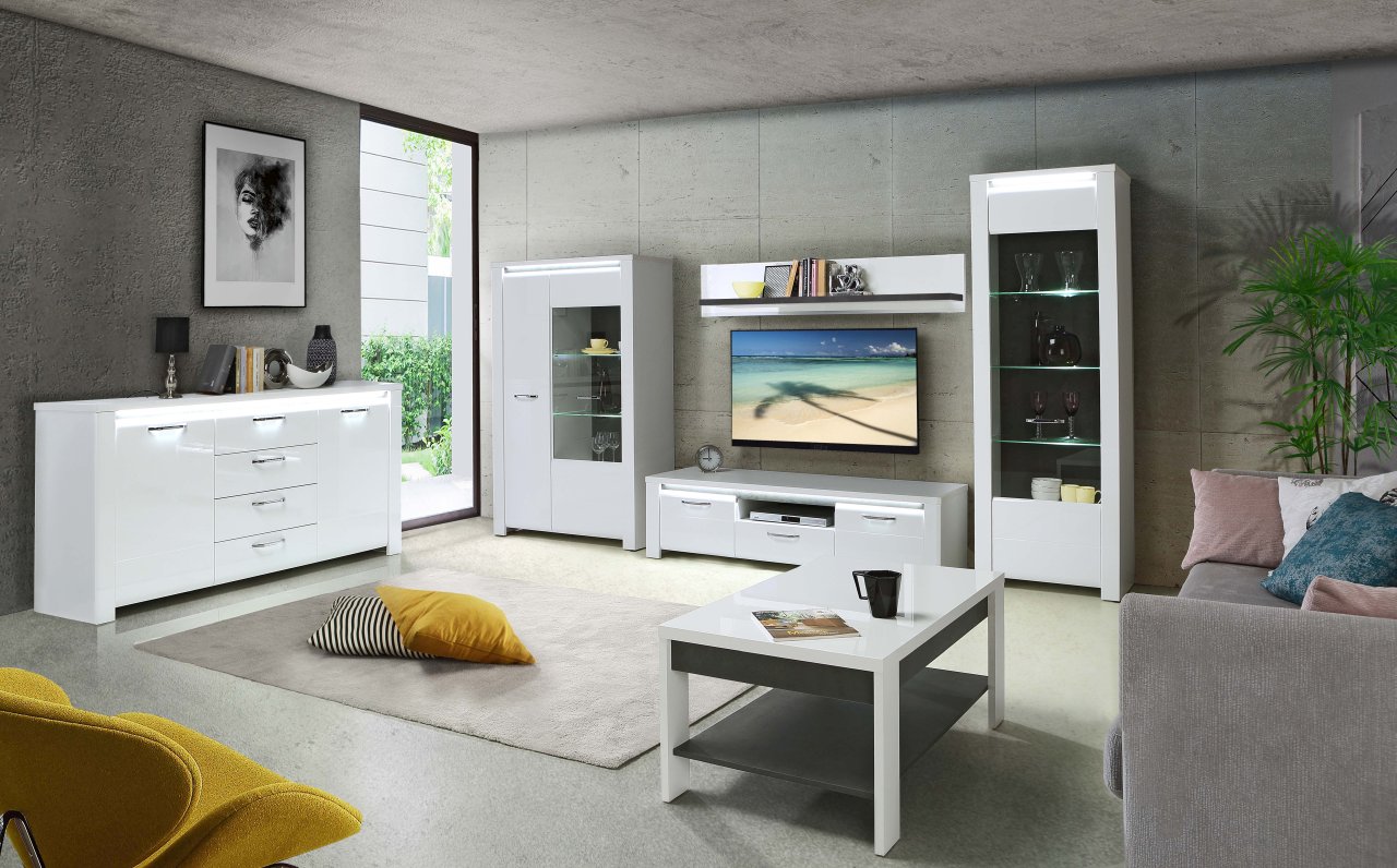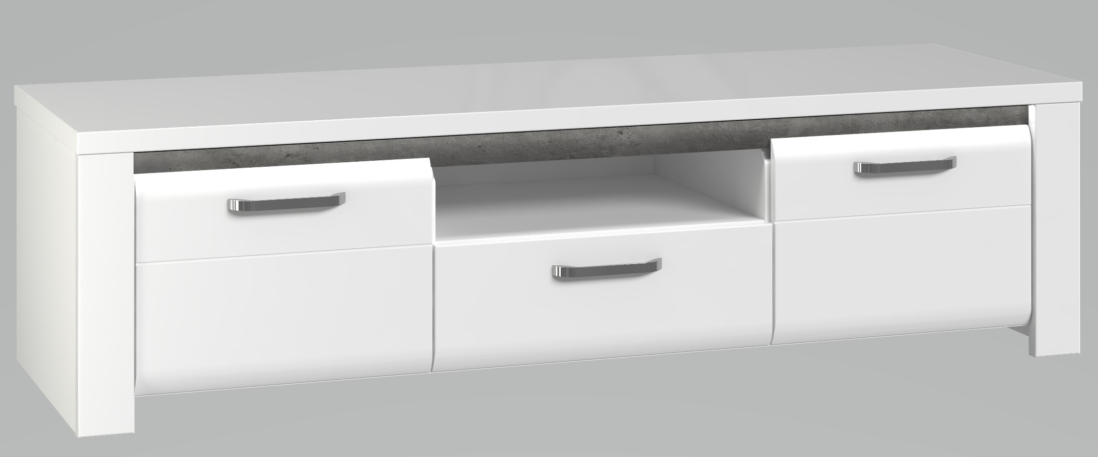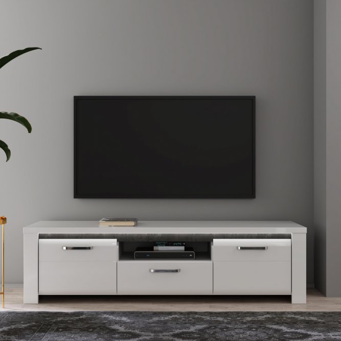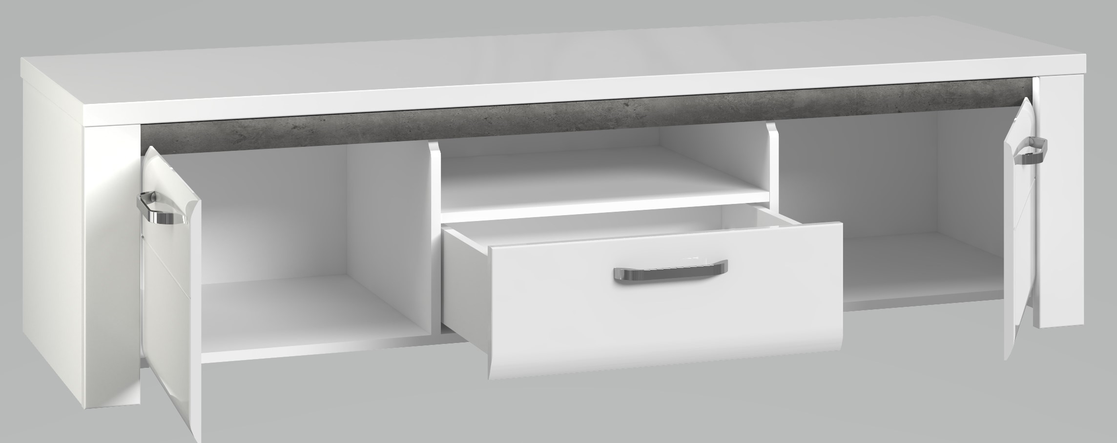 Comoda TV Brugia, de culoare alb lucios, este o piesă elegantă și stilată, perfectă pentru amenajarea livingului tău.Cu un finisaj alb lucios, comoda adaugă un aer sofisticat oricărui spațiu. Liniile sale curate și formele geometrice îi conferă un aspect contemporan, care se potrivește perfect cu diverse stiluri de interior.