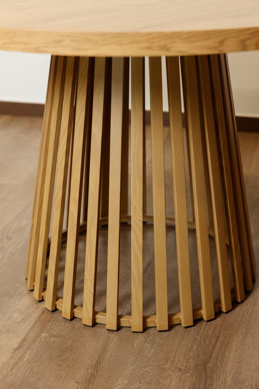 Masă Rondo - rotundă, blat MDF, culoarea Natur, cu diametrul de 110 cm – elegantă și rezistentă, ideală pentru o sufragerie modernă.