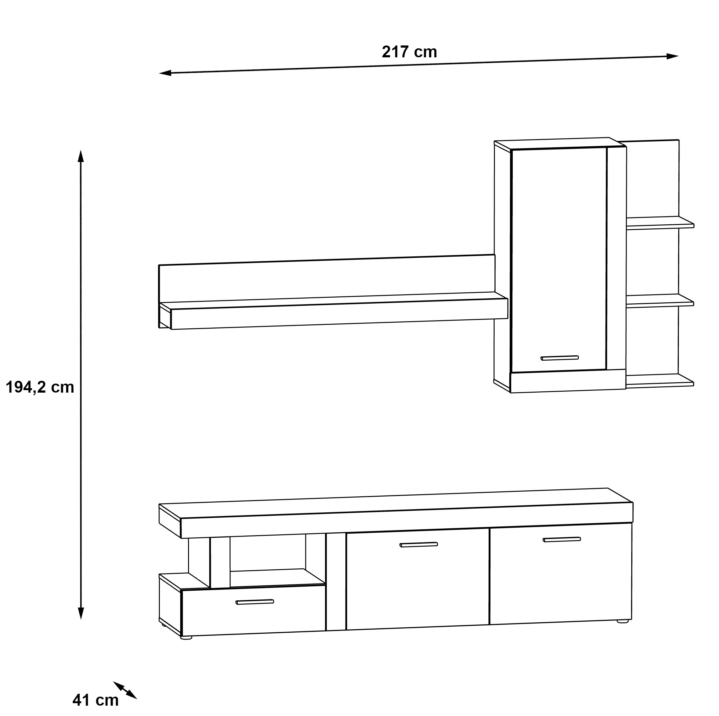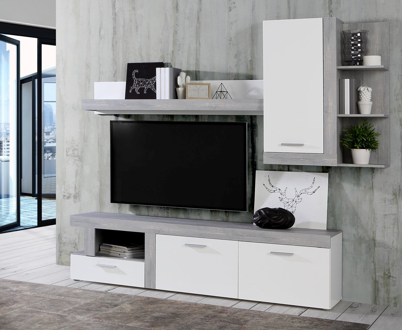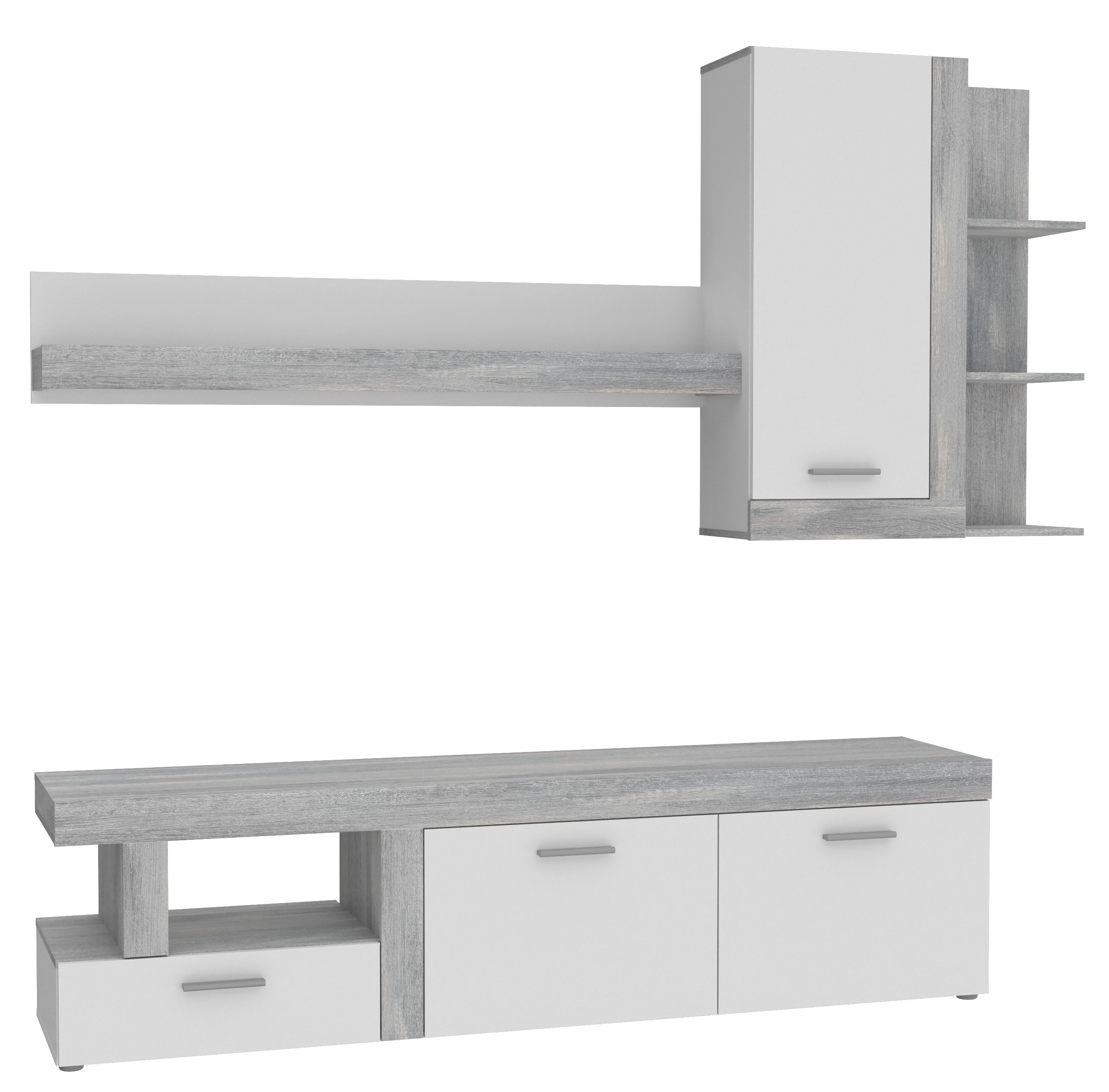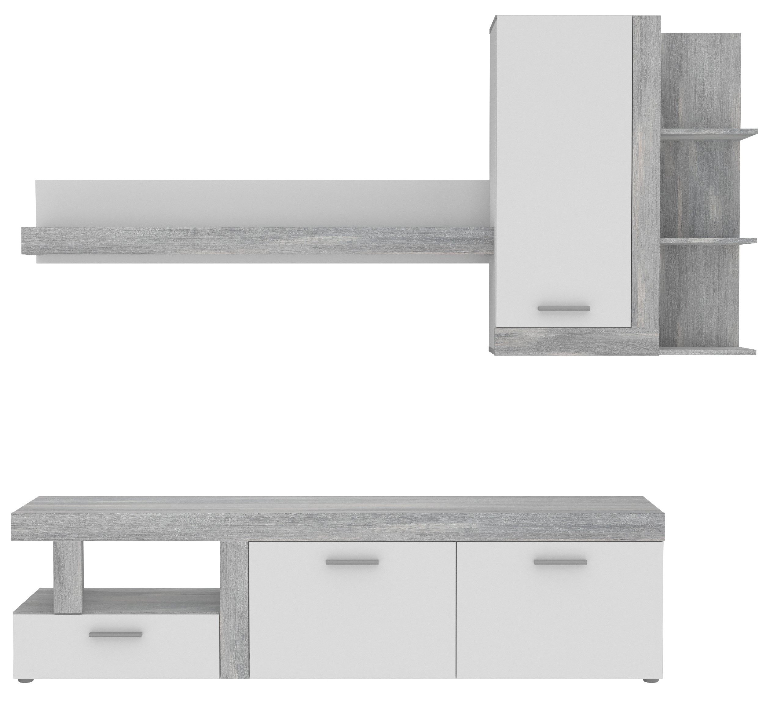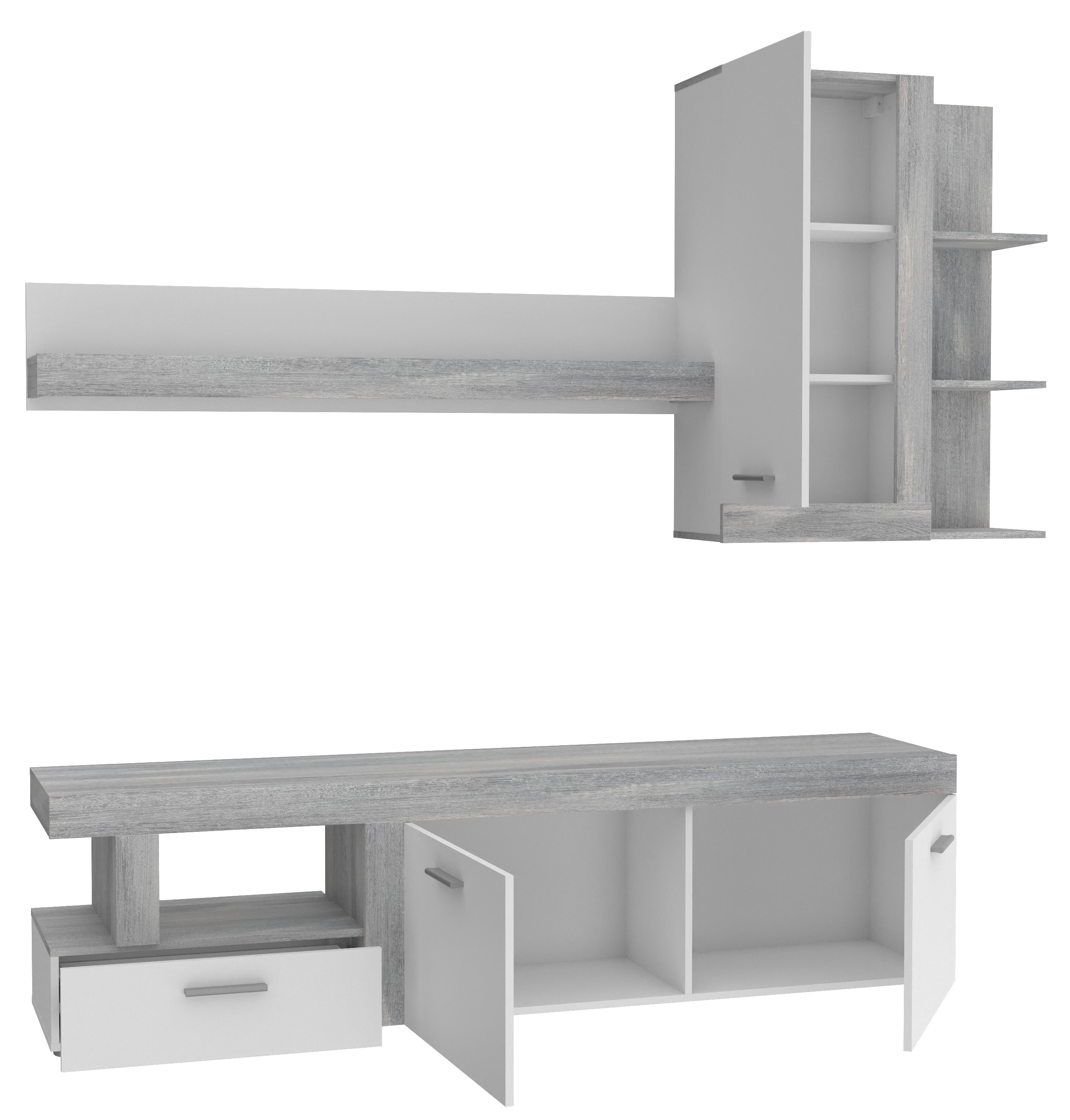 Peretele Juleda este format dintr-un raft, o vitrină suspendată și o comodă TV, fiecare element fiind gândit pentru a oferi atât estetică, cât și funcționalitate. Raftul gri poate fi folosit pentru expunerea cărților sau a obiectelor decorative, adăugând un accent personal și creativ. Vitrina suspendată, cu ușă albă și polițe deschise, permite evidențierea unor articole speciale, aducând un aer elegant.Comoda TV, cu un design minimalist, completează ansamblul printr-o structură practică, oferind spațiu de stocare pentru echipamentele multimedia și organizarea diverselor accesorii. Cele două nuanțe colaborează armonios, oferind un aspect bine definit.