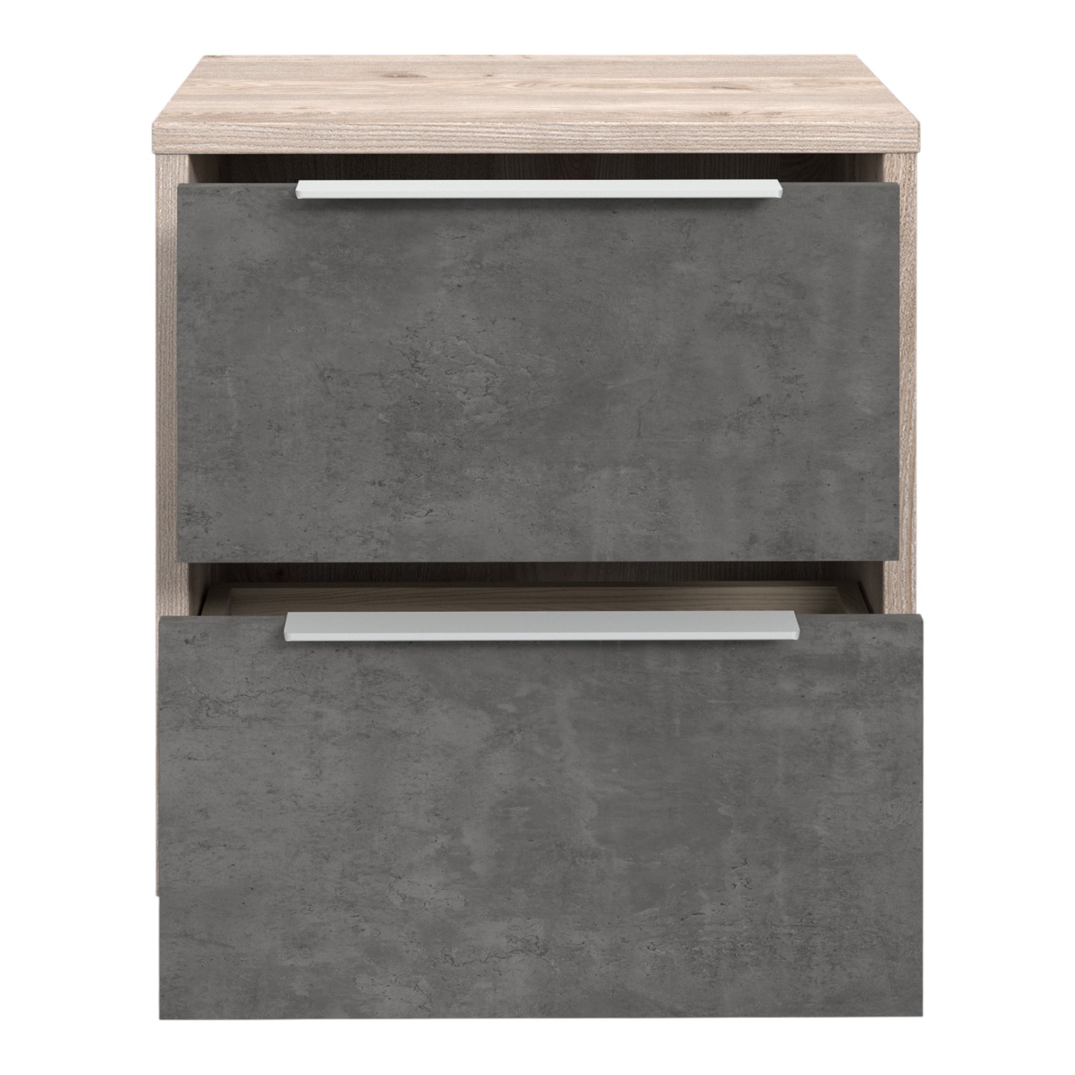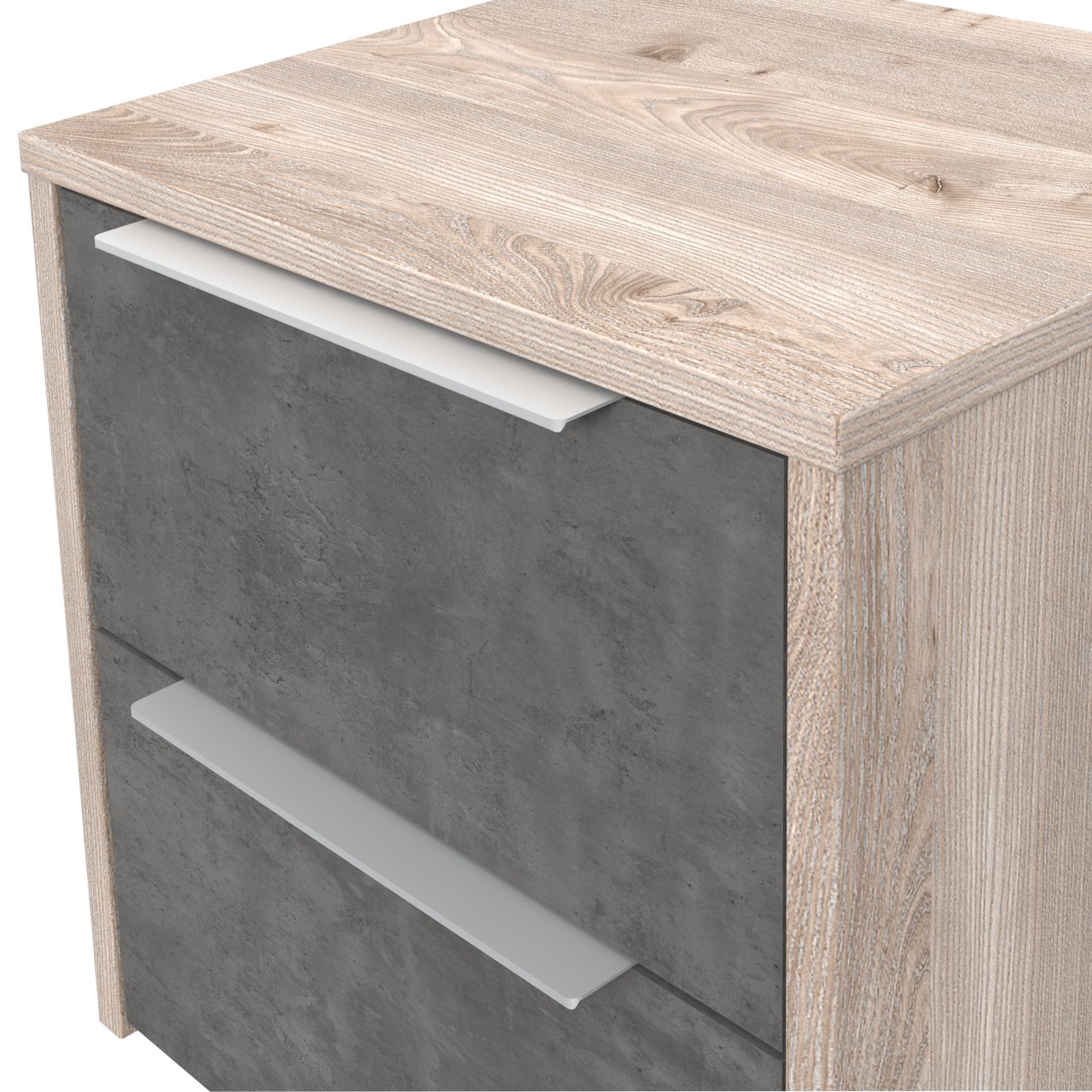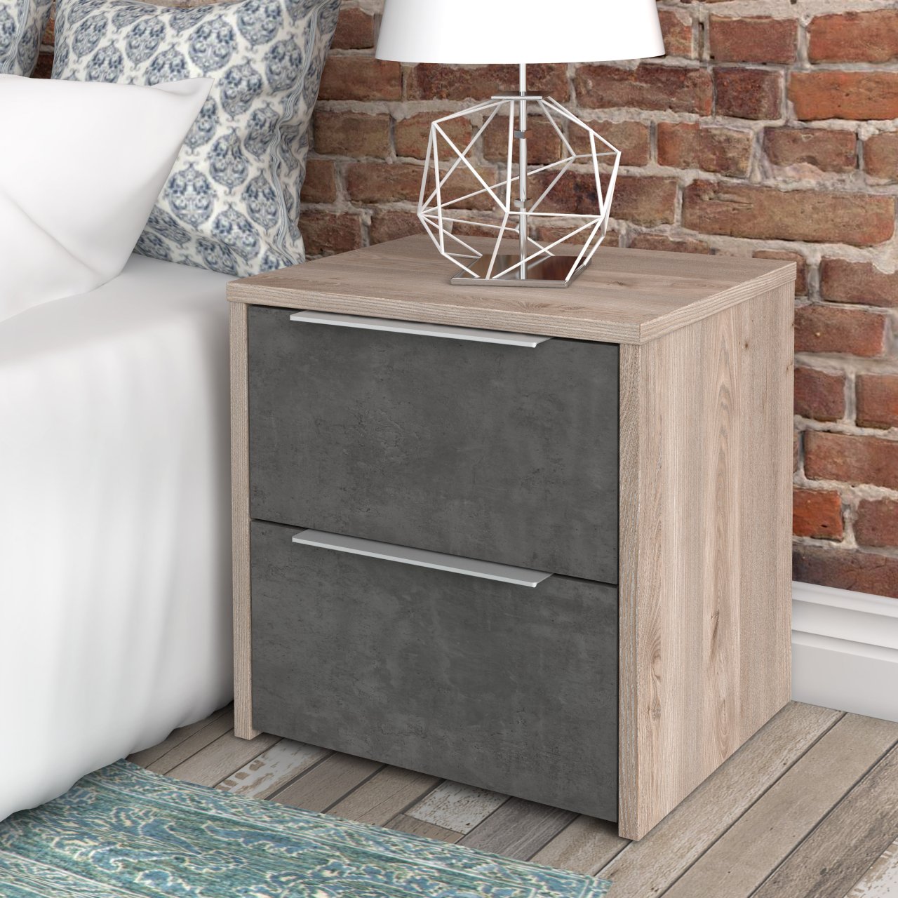 Тумбочка Esporao Conforama с двумя ящиками натурального цвета в сочетании с бетоном, идеальный современный предмет для современной спальни. В его дизайне теплые тона дерева сочетаются с индустриальным видом бетона, создавая привлекательный контраст. Два ящика предлагают достаточно места для хранения личных вещей и идеально подходят для хранения книг, часов и других аксессуаров под рукой. Прикроватная тумбочка Esporao Conforam идеально вписывается в различные стили декора, привнося свежий и инновационный вид.